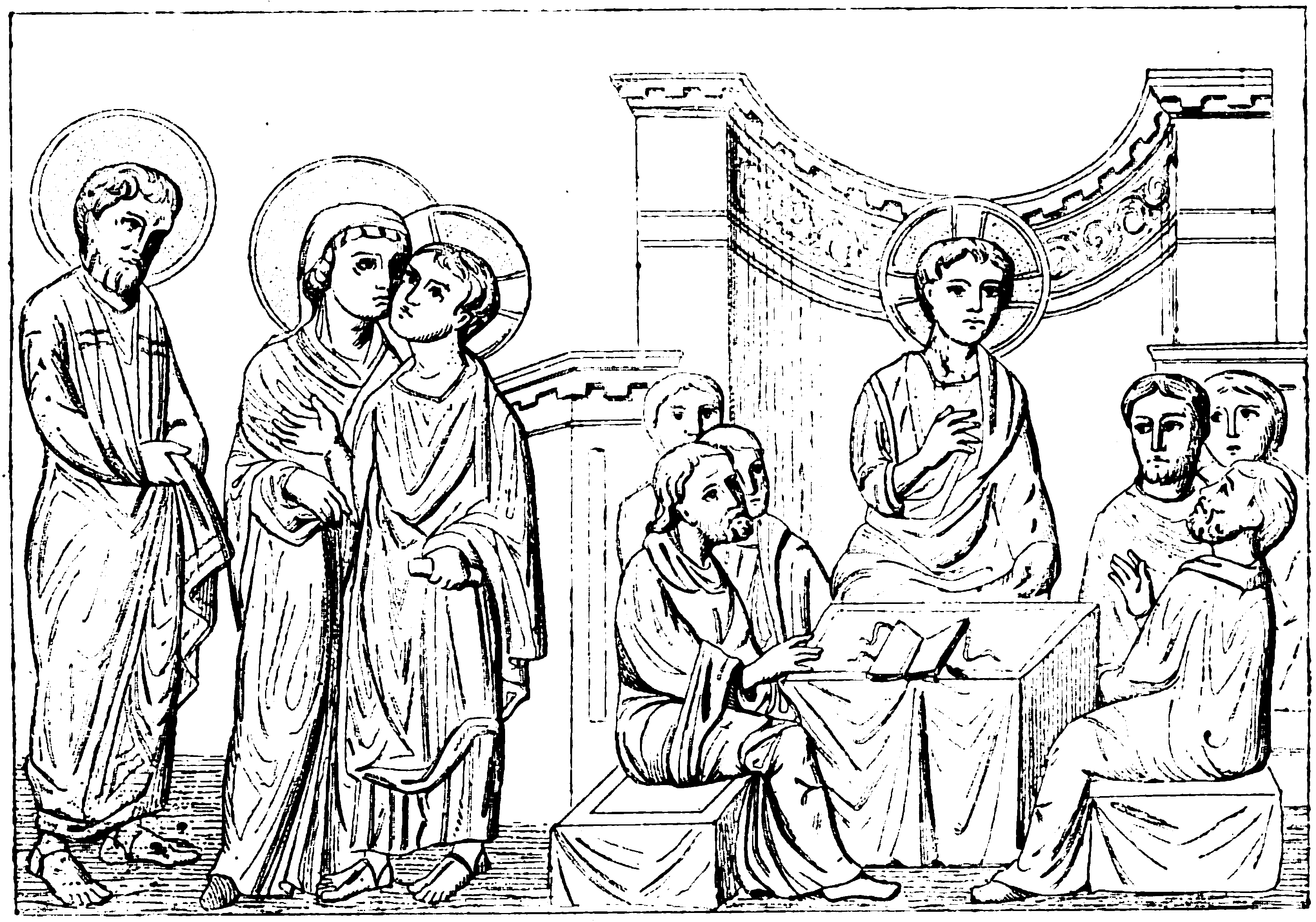 Сцена эта обставлена двумя другими, указывающими на предшествующий и последующий моменты проповеди: Спаситель идет в иерусалимский храм со свитком в левой руке – символом учительства, и: Богоматерь обнимает с нежностью любимого Сына, найденного после трехдневной разлуки; за Богоматерью стоит Иосиф, молчаливый свидетель происходящего перед его глазами. Эти два дополнительных изображения дают особый оттенок главной дидактической сцене, ослабляя ее церемониальный характер.