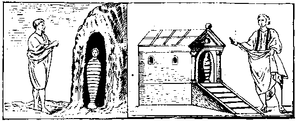 Иисус Христос в обычном типе юноши держит в правой руке жезл и касается им спеленутой мумии, стоящей в гробнице. В одном случае гробница имеет вид пещеры (катак. Гермеса, рис. 116), в большинстве же случаев она представляет собой форму римских колумбариев, в которых помещались урны с прахом умерших: здание небольшое, довольно высоко поднятое над поверхностью почвы, снабженное лестницей, фасадом, украшенным двумя колоннами или просто столбами, с антаблеманом и пофронтонным покрытием.