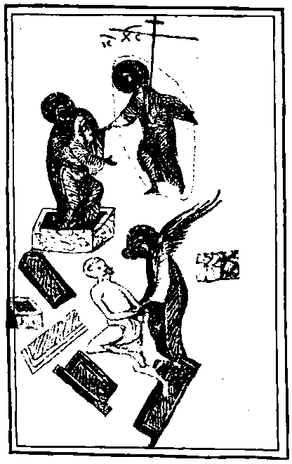 На византийском металлическом окладе Х-ХI вв. в Лувре (№ Д. 709) (см. рис. 174)2523: ангел с жезлом сидит у пещеры с решеткой; внутри пещеры видны погребальные пелены; у входа – упавшие стражи (повреждены). Многочисленные надписи из Евангелия и Октоиха сообщают полную определенность всем деталям изображения. Над гробницей надпись: «ὁ τάφος τοῦ Κῦ»; над ангелом: «δεῦτε ἴδετε τὸν τὸπον ὅπου ἔκειτο ὁ Κύριος» (Мф. 28:6); над св. женами: «εἶχε δέ αὐτάς τρόμος καὶ ἔκστασις» (Мк. 16:8); над стражами: «καὶ οἱ φυλάσσοντες ἀπενεκρώθησαν». Вокруг изображения по краям оклада: «ὡς εὐπρεπής ταῖς γυναιξίν ὁ ἄγγελος, νῦν, ἐμπεφάνησται καὶ πηλαυγῆ φέρων τῆς ἐμφύτου σύμβολα ἀῦλου καθάρότητος. τῇ μορφῇ δέ μηνύων τὀ φέγγος τῆς ἀναστάσεως κράξων ἐξηγέρθη ὁ Κύριος"2524. В Евангелии № 74 явление ангела св. женам повторено два раза в формах довольно однообразных2525: ангел сидит на прямоугольном камне возле отверстия пещеры, заделанного решеткой; перед ним стоят четыре св. жены в нимбах (л. 60 об.); передняя держит в руках сосуд в виде кацеи с огоньком (л. 100 об.). В Евангелии Иоанна несколько изображений (л. 209): Мария Магдалина стоит у гроба и плачет (Ин. 20:1); беседует с двумя апостолами (Ин. 20:2); апостолы стоят у гроба (Ин. 20:8); Мария Магдалина стоит у гроба перед двумя ангелами (Ин. 20:12–13); припадает к ногам Христа (Ин. 20:16). В гелатском Евангелии четыре изображения: погребальная пещера; у входа сидит да камне ангел и указывает двум плачущим женам на внутренность пещеры; три воина в кольчугах, со щитами, стоят возле входа в пещеру (л. 86; ср. 138 об., 217 об. и 272 об.). Лаврентиевское Евангелие, л. 59 и. 209 об. (ср. Евангелие № 74; гроб = саркофаг). Никомидийское Евангелие, л. 246 (ангел – на скале пещеры). Евангелие № 54: внутри пещеры видны белые погребальные пелены; возле пещеры три стража стоят, опершись на свои щиты; в стороне лежат мечи и копья; ангел в голубой тунике и сером иматии сидит на четырехугольном камне; перед ним две плачущие жены (л. 108). Евангелие № suppl. gr. 914, л. 91 об. Евангелие императорской публ. библ. № 105, л. 67 (гробница = будка). Коптское Евангелие, л. 86, 214 об. (в пещере погребальные золотые одежды; св. жены с кадильницами и одна с ящиком в руках). Ипатьевское Евангелие № 2 (в Евангелии Марка). Армянское Евангелие императорской публ. библ. 1635 г., л. 17 (св. жены с ароматами в руках; стражи спят). Мозаика в Монреале (в пещере – белая пелена; стражи со щитами упали)2526. Греческая икона в Академии художеств XVII в. № 12 (гробница = саркофаг; ангел на камне – ὁ λῆθος; восемь спящих воинов). Греческий подлинник разделяет разобранную композицию на два самостоятельных изображения: а) кустодия, стерегущая гроб, и б) ангел благовествует мироносицам о воскресении. Мраморный гроб, запечатанный четырьмя печатями; вокруг него воины лежат: одни оперлись на щиты и копья (εἰς ἀσπίδας καὶ λόγχας), другие – на колени, третьи – на руки; среди них сидит в недоумении (καθήμενος ἀπορεῖ) Логин-сотник. Перед гробом – мироносицы сидят и плачут; в руках их различные сосуды для мира – глиняные и стеклянные (διἀφορα ἀγγεῖα μυροφόρα ἄλλα ἑκ πηλοῦ καὶ ἄλλα ἐξ ὑάλου)2527. Последующий момент евангельского повествования подлинник описывает так: открытый гроб; на крышке его сидит ангел светозарный; в одной руке ангела жезл (κοντάρι), другой он указывает на пелены и сударь в гробе. Перед гробом – мироносицы с миром2528. Подобное ра
