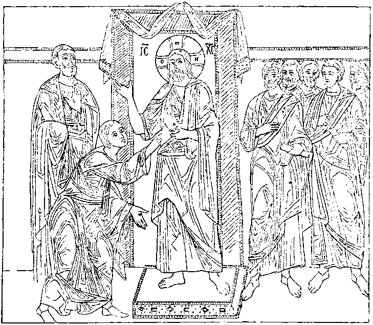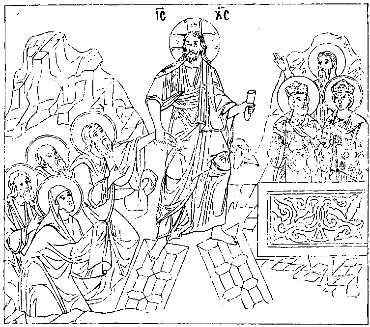 Значение первой группы совершенно ясно; вторая, по мнению большинства специалистов, означает вознесение Иисуса Христа на небо2496. Проф. Кондаков не принимает этого объяснения, так как в композиции вознесения число апостолов обычно простиралось до двенадцати и никогда не ограничивалось двумя2497; притом апостолы здесь изображены спящими (?); вознесение в подобной форме – с десницей Божией, принимающей Иисуса Христа, – появляется лишь в VI-IX вв. Он видит в этой сцене воскресение Иисуса Христа, а в двух апостолах – двух стражей2498. Трудности изъяснения этим, впрочем, не устраняются; но общепринятое мнение имеет за собой преимущество в аналогичных изображениях вознесения на памятниках последующего времени; между тем как аналогичных форм воскресения нет ни в памятниках восточных, ни в западных.