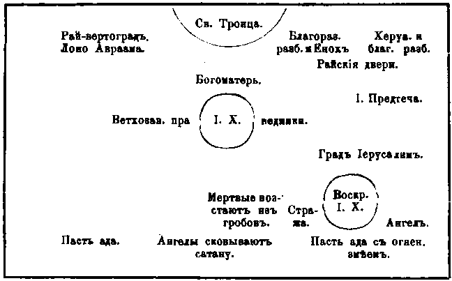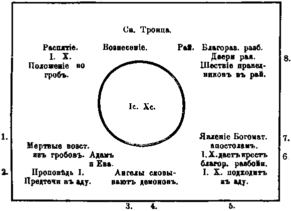 Многосложная икона № 3235 имеет опять свои особенности, которые будут ясны из нижеследующего графического рисунка; ее многочисленные надписи (обознач. на нашем рис. цифрами), почти все, составляют буквальные выдержки из подлинного Евангелия и церковных песнопений.