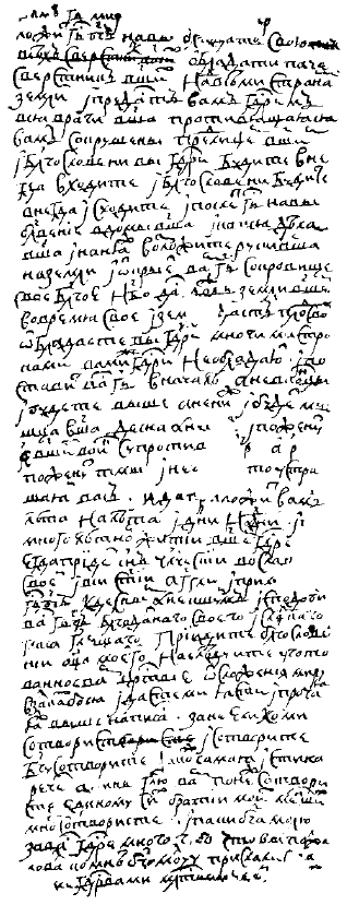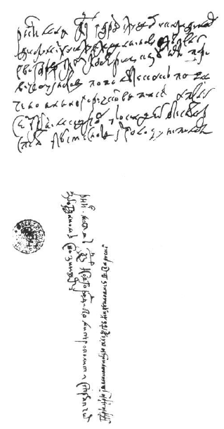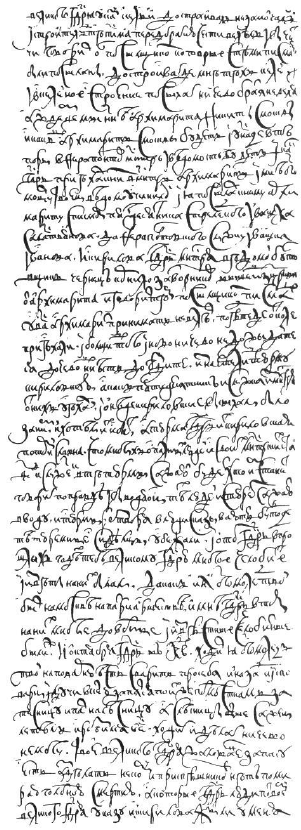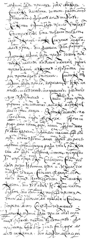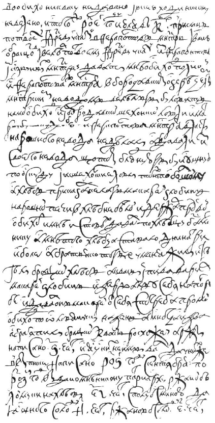 В Я оторвана бумага; текст не сохранился. Далее в X основным почерком приписка Писалъ нашего строения Новаго Иерусалима Воскресенского монастыря лѣта 7174-го; др. почерком сделана др. приписка Тако въ листъ от святѣйшаго Никона патриарха написан и посланъ в Царьградъ к святѣйшему патриарху Деонисию Цареградскому с черниговским // полковникомъ и с своимъ племянником, с Федотомъ Марисовымъ. И на дороге в Киеве тотъ листъ перенят и с племянникомъ патриаршимъ, с Федотомъ Марисовымъ, прислан к Москвѣ. А подменной листъ написан был по-гречески, а писал грекъ Димитрей. И во сто семьдесять пятомъ году, какъ был Соборъ, и тотъ грекъ Димитрей взятъ был к Москвѣ, и за карауломъ в набережных полатах от великого страху, бояся пытки, самъ себя ножемъ зарѣза и умре; далее в В, К доб. Писан нашего строения Новаго Иерусалима Воскресенского монастыря 174-го году; далее в Л доб. Писан нашего строения Новаго Иерусалима Воскресенскаго монастыря лѣта 7174-го года. Ниже под строкой по обеим сторонам подписи: слева – Вольфенбиттель, Августа 8-го дня 1838; справа – Выписка по рукописи: № 210.5. Mst. Extvafo. Folio; далее в У, П, Б, Г, Щ, И, З, Н, Р, С доб. Писанъ нашего строения Новаго Иерусалима Воскресенскаго монастыря лѣта 7174-го году; далее в Ж, Ю доб. Писана нашего строения Новаго Иерусалима Воскресенскаго монастыря лѣта 7174-го года; далее в Д доб. Писано нашего строения Новаго Иерусалима Воскресенскаго монастыря 7174 году.