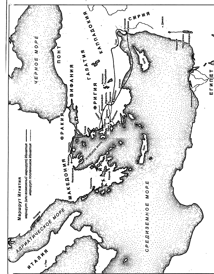 Д.Ляйтфутом (см. примеч. к строке 12 на с. 484–485, где отмечены все нужные страницы) показана несовместимость описанного здесь морского путешествия из Селевкии в Смирну с указаниями, содержащимися в посланиях Игнатия. Карта, отражающая подлинный маршрут св. Игнатия (с возможными вариантами пути), воспроизведена (с русским переводом географических названий) в настоящей книге по изданию LHH.