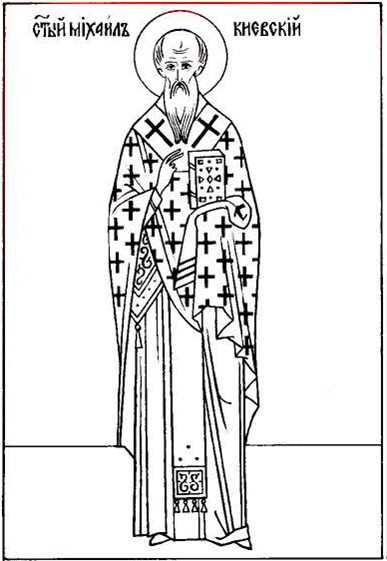 Свире́пеющия неве́рием лю́ди укроти́в в Ру́сстей земли́/ и яре́м Це́ркви повинове́ния возложи́в на ня,/ приве́л еси́, Михаи́ле, мно́гия де́латели в виногра́д Небе́снаго Влады́ки./ Сотвори́ и нас, свя́те, му́дрыя де́латели, я́ко прино́сим ти днесь хвале́ние.