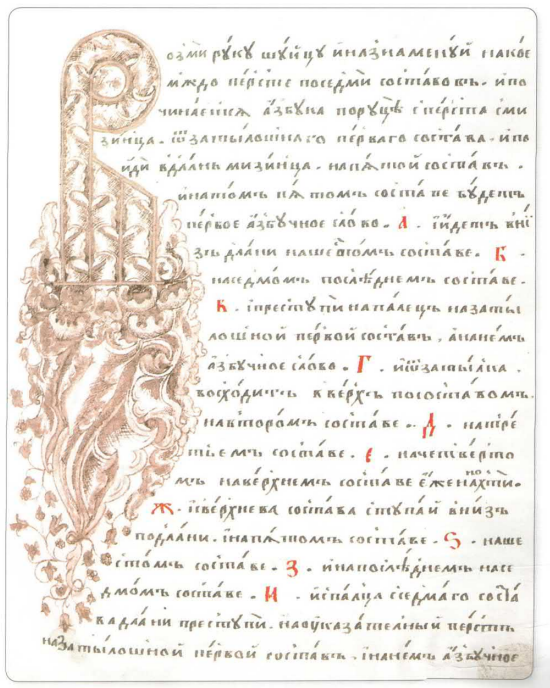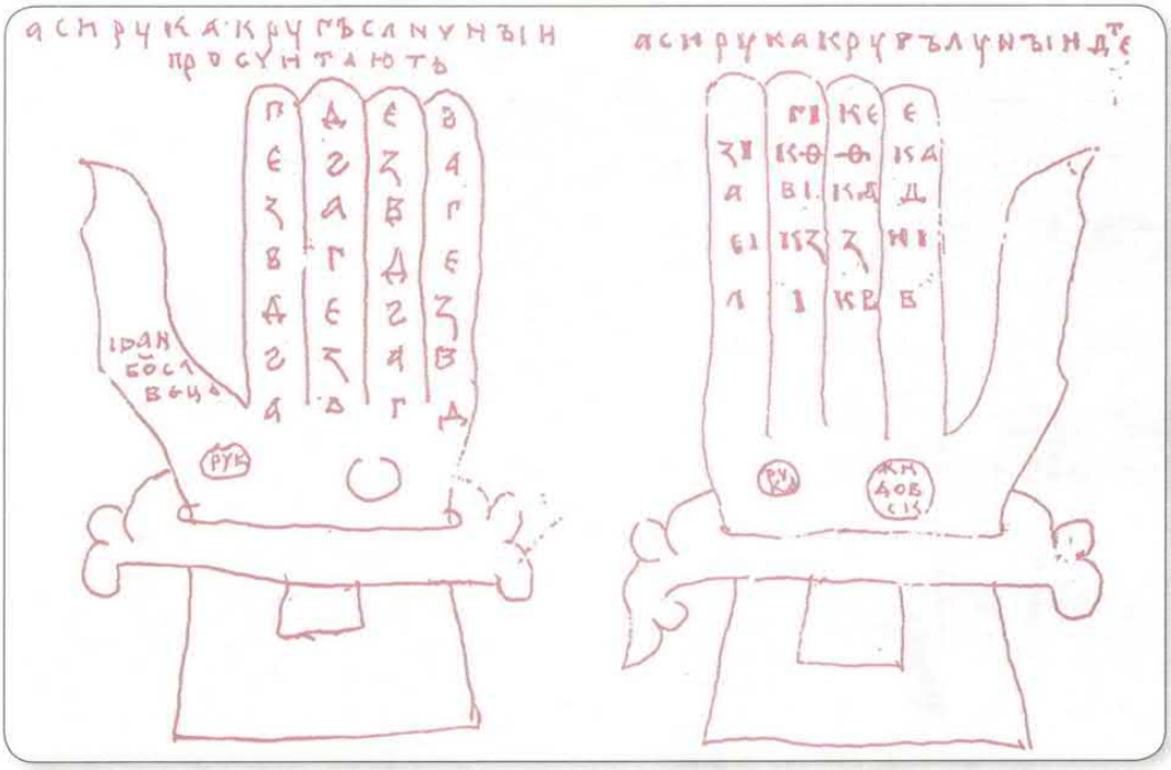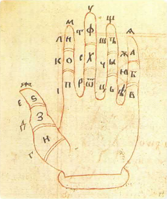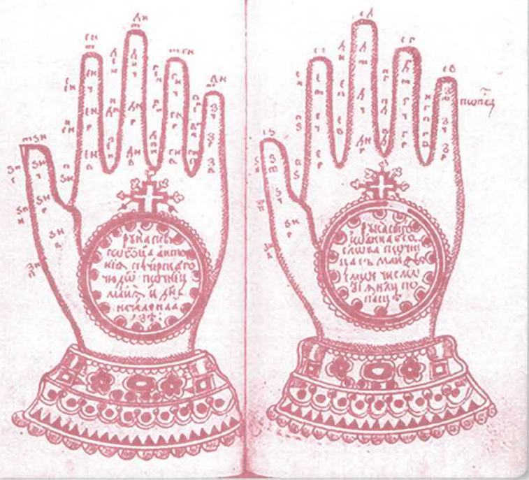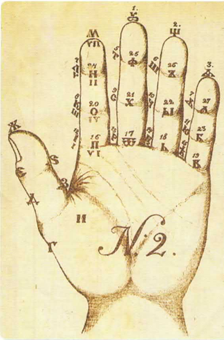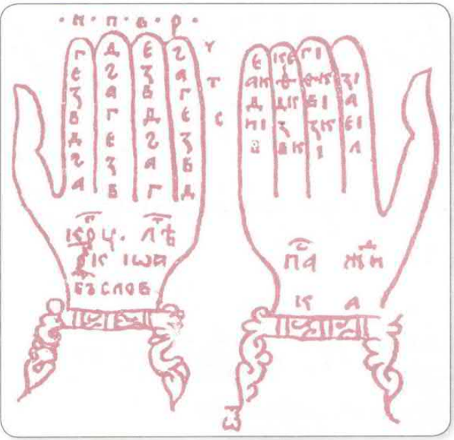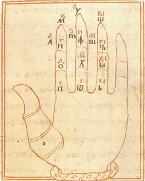 «Рука Богословля». Рукопись конца XVII в. Расположение ключевых слов (букв)