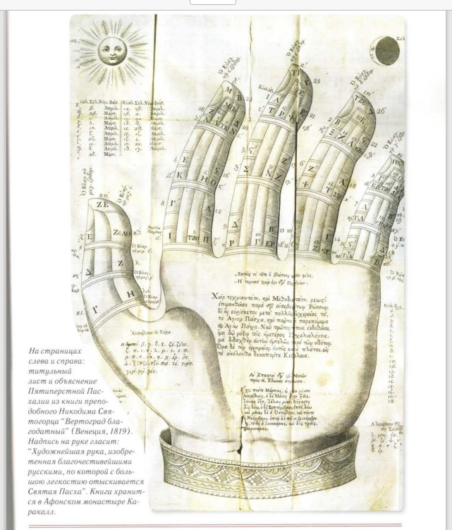 На страницах слева и справа: титульный лист и объяснение Пятиперстной Пасхалии из книги преподобного Никодима Святогорца «Вертоград благодатный (Венеция, 1819). Надпись на руке гласит: «Художнейшая рука, изобретенная благочестивейшими русскими, по которой с большою легкостию отыскивается Святая Пасха». Книга хранится в Афонском монастыре Каракалл.