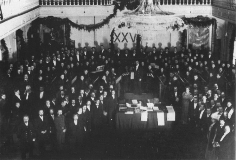В певческой нахожу много мальчиков, взрослых людей и даже стариков. Какой-то высокий, тощий человек со скрипкой в руке взбирается на подмостки и дает знак смычком. Окружающие его певчие, мальчишки и взрослые, стихают и ждут знака. Скрипач проводит смычком, издает протяжный звук, а затем этим же смычком готовится дирижировать344. Разучивают концерт под названием «На реках Вавилонских». Меня поражают торжественный мотив, стройность хора и замечательная гармония детских голосов.