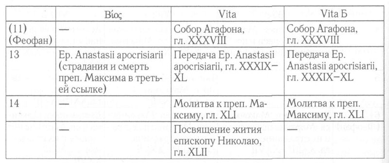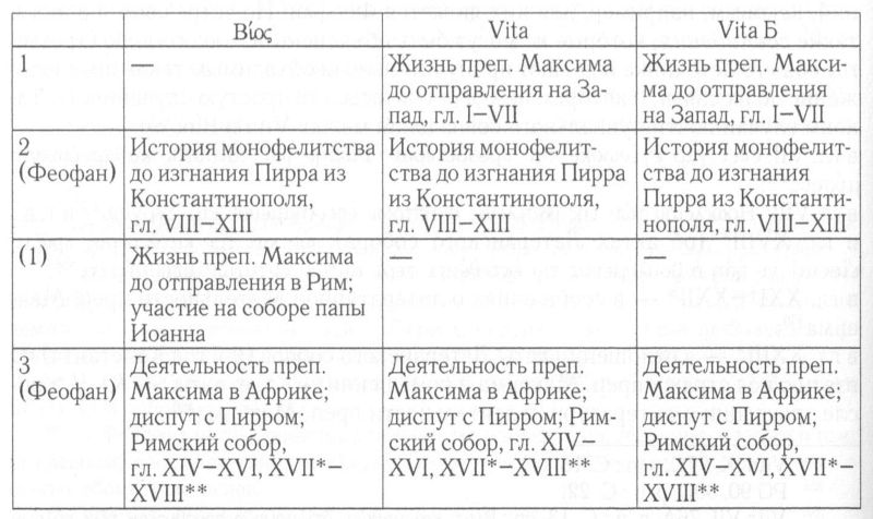 Установление зависимости Βίος’а от столь позднего источника, как Феофан, отчасти упрощает решение вопроса об отношении этого жития к другим, большей частью дословно совпадающим с ним документам. Из них Compendium Vindobonense тоже нужно признать источником для Βίος’а. Это житие не могло быть извлечено из Βίος’а, ибо в таком случае представлялось бы странным отсутствие в нем замечаний о деятельности преп. Максима при папе Иоанне, его знаменитом диспуте с Пирром, беседе с епископом Феодосием; странным бы так же казалось помещение сведений о творениях преп. Максима до рассказа об исповедническом подвиге св. отца, а не после рассказа о первой его ссылке, как в Βίος’е,2546 и еще более странным – неясное представление о наказании учеников преп. Максима.2547
