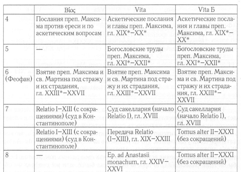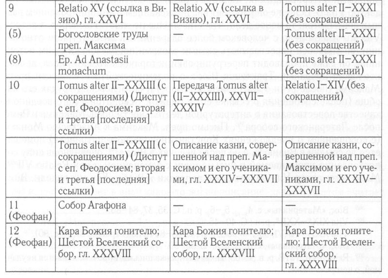 Что касается Relatio, Tomus alter и других современных преп. Максиму документов, то зависимость от них Βίος’a не нуждается ни в каких доказательствах. Можно только отметить, что допущенные в Βίος’е сокращения и некоторые изменения в тексте этих документов, в общем, нужно признать неудачными, почему и текст их в редакции Βίος’а малопригодным для исторического пользования.2556