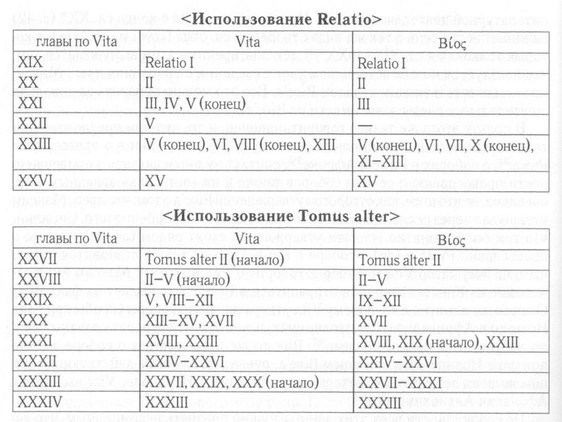 Vita стоит в тесном соотношении с Βίος’οм. Однако, прежде чем с точностью установить приоритет одного из этих памятников, необходимо решить вопрос о первоначальном виде Vita.