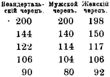 Эти цифры ясно указывают, что найденные скелеты принадлежат к неандертальскому типу, что этот тип не есть исключение, а есть нормальный, что существовала раса неандертальского типа. Предположение о всем этом было гораздо раньше высказано Катрфажем. Открытие в гроте Biche-aux- roches представляет много данных для суждения о людях неандертальского племени. Оказывается, что эти люди фабриковали каменные орудия, утилизировали кости животных, например, клыки слонов, пользовались краской для разрисовки их тела и одежд, обжигали горшки и хоронили своих мертвецов. (Nadailac, la grot de la Biche-aux-roches. Rev. Quest Scient. 1886 р. 520). Эти данные побуждают поставить людей неандертальского типа выше некоторых из существующих племен, а не видеть в них посредствующие звенья между предшественником человека и современными низшими типами человечества.