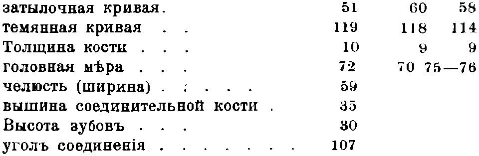 В 1886 г. в августе месяце на антропологическом конгрессе в Намуре два антрополога Charles de Puydt и Lohest сделали сообщение, которое, нам кажется, вполне решает вопрос о неандертальском черепе и решает его бесповоротно в пользу взгляда Катрфажа. Названные антропологи в гроте Biche aux roches близ Spy нашли два скелета. Лица, которым они принадлежали, очевидно, были погребены, ибо кости, разбитые тяжестью последующих отложений, занимали, однако, их естественное положение. Около них найдены были орудия типа мустерийского, кости, изображающие палки начальника, многие костятые пластинки с изображением тюленей, три осколка от горшков, еще выдолбленную кость, наполненную олигистом (железным блеском), употребляемым для татуирования. Один из этих скелетов принадлежал женщине, другой – юноше (швы черепа не были стерты). Черепа их воспроизводили тип неандертальский, кости большой толщины (9 mm), череп женщины чисто долихоцефальной (70), междубровная область развита недостаточно; головная мера другого черепа не была определена, ее можно положить приблизительно равной 75–76, таким образом, как поддолихоцефальную. Изучение этих двух черепов показывает в них развитие надбровных дуг, лобные впазушины очень заметны, глазные впадины очень велики, лоб низок и загнут назад, что особенно обнаруживается у женщины, затылочная область и преимущественно можжечковая часть весьма развиты. Прогнатизм выступает у них довольно заметно, apophyses geni обозначены явно. Референты ничего не сообщили о платикнемии и о полулунной вырезке локтевой кости. Измерения черепов дали цифры, поразительно сходные с цифрами, полученными от измерения неандертальского черепа.