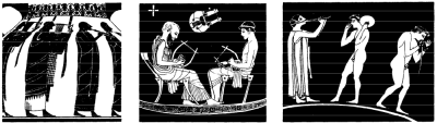 Слева: музыка жертвенной процессии (по аттической чернофигурной амфоре из Вульчи, 6 в до н. э.)