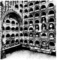 (лат. ниша голубятни), так назывались с кон. республиканского Рима до сер. императорской эпохи вследствие их сходства с нишами голубятен ниши, в которых устанавливались урны с пеплом умерших в специально выстроенных для погребения помещениях; в настоящее время К. обозначает весь погребальный комплекс, где хранятся урны с пеплом тел, сожжённых в кремационных печах. Прямоугольные или овальные по своей форме К., которые строились также и под землёй, вмещали до 700 ниш с замурованными урнами. В осн. К. являлись местом захоронения бедных граждан.