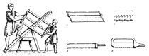 а. продольная распилка деревянной балки, установленной на козлах.