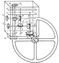 Штифт А на оси при каждом обороте приводит в движение шестерню В. На оси В – В´ насажен бесконечный винт С, который приводит в движение шестерню D, а соединённый с ней параллельно диск указателя Е1 показывает количество пройдённых саженей. На соответствующей оси Е–Е1 вращается бесконечный винт F, приводящий в движение шестерню G. Бесконечный винт Н на оси G–G´ переносит отсчёт на шестерню J, т. о., на диске указателя Е1 подсчитывается число стадиев. Ещё один перенос через L и К–К´ позволяет видеть на диске Е2 число пройдённых миль. Кроме того, после каждой мили в трубку М через дырчатый диск Е3 при каждом точном совпадении отверстия на диске с отверстием трубки в последнюю падал шарик, достигавший счётного ящика А, что позволяло производить, помимо визуального, также и акустический контроль пройдённого расстояния