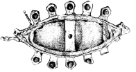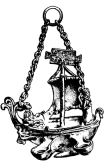 Бронзовая лампа в форме корабля с десятью гнёздами для плошек 42 * 17 * 23 см весом 4.875 кг. Мостки в носовой части, у мачты, у руля (не сохранился), якорная цепь («навесок») и ростральная фигура (пожирающее людей морское чудовище) припаяны.