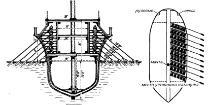 Реконструкция (рис. слева) 5-палубной пентеры в поперечном разрезе Палубы находятся одна над другой Длина вёсел колеблется от 2.25 до 5,85 м (отношение плеча нагрузки к плечу силы колеблется от 4,3:1 до 3,5:1). При этом почти невозможно было выдерживать такт.