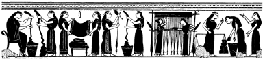 Роспись на вазе иллюстрирует осн. этапы изготовления Т., которым занимались хозяйка, её рабыни или дочери (ваза изготовлена в 560 до н. э.). Что касается более детального представления об этом процессе, то он почти не описан в лит-ре и по археологич. находкам о нём мало что известно. Ткани изготовлялись изо льна, шерсти, в эллинистич. период, кроме этого, – из хлопка (импорт?) и шёлка (импорт). В производстве парусов и канатов применялись пенька и эспарта. Иногда в ткань одежды для умерших добавляли асбестовые волокна. Т. красили, ткали из цветных ниток, украшали вышивкой, обшивали каймой. Простые ткани изготовлялись в домашних условиях и иногда шли на продажу, ткани же высокого качества производились опытными рабынями и рабами. Чтобы сукно долго носилось, его нужно было валять, для этого требовалось не только спец. оборудование, но и определ. знания и опыт задействованных в этом технологич. процессе рабочих. Что касается других технологич. процессов изготовления Т. (прядение, окрашивание пряжи, и пр.), то о них известно очень мало. Существовал ли только тканый Т. или наряду с ним был ещё и «вязаный», на этот вопрос ответить трудно, хотя известно, что для артистов нужны были трикотажные костюмы, а для охоты и рыбной ловли необходимы были вязаные сетки и сети. Т. изготовлялся и для нужд армии. Образцов Т. сохранилось мало, исключение здесь составляет найденная в песках Египта т. н. коптская ткань, имевшая не всегда высокое качество изготовления. Тот факт, что для поясного портрета умершего требовался особый вид холста, служит доказательством использования Т. в различных целях.