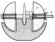 Независимое вращение сферических дисков (13) в двух направлениях обеспечивалось специальной «буксой» (сира{?} 7), обитой листовым железом (5, 6);