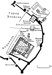 (греч. Eleusis), город со знаменитым святилищем мистериального культа, расположен в 22 км от Афин, с которыми Э. связан т. н. священной дорогой. Это уже в микенскую эпоху укрепл. место с 7 в. до н. э. принадлежало Афинам. С 403 до 401 до н. э. Э. был убежищем афинских олигархов, ещё раз став независимым. Мистерии Деметры и Посейдона считались частью афинского государств. культа. Они праздновались в телестерионе, сооруж. на месте микенского мегарона в 6 в. до н. э. (квадратном колонном зале, снабженном рядами сидений по периметру). Его окончательная постройка завершена в 5 в. до н. э. при Иктине. Греч. раскопками 1882–1890 святилище было полностью исследовано. В 1859 здесь был найден большой элевсинский священный рельеф.