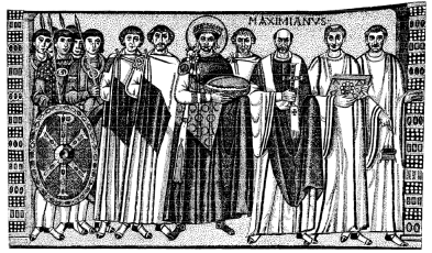 Император Юстиниан І с архиепископом Максимианом и свитой.