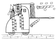 Боевая колесница времён Синахериба с козырьком для командира и углублённой платформой для стрелков, снабжённая длинным древком с копьевидным наконечником, движущаяся по настилу. Фронтальную часть колесницы, уязвимую для горящих метательных снарядов, смачивал помощник, используя ковш с длинной ручкой. С боков колесницу защищали кожаные покрывала, застёгивавшиеся при помощи системы петель и стерженьков