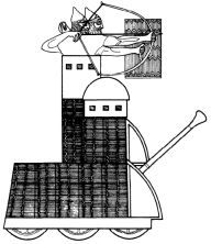 Передний план: шестиколёсный таран с двумя ударными штангами; в верхней части – смотровые окна командного пункта (боевая рубка).