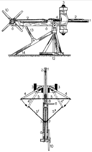 14. регулируемая опора для изменения горизонтального угла (для прицеливания) при установке орудия.