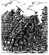 Задний план: осадная башня с гремя ударными штангами; на верхней площадке лучник в латах и метатель снарядов со щитом в левой руке, последний прикрывает обоих (рельеф приблизительно 850 до н. э. из Ниневии)