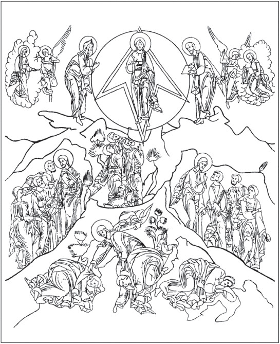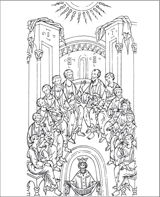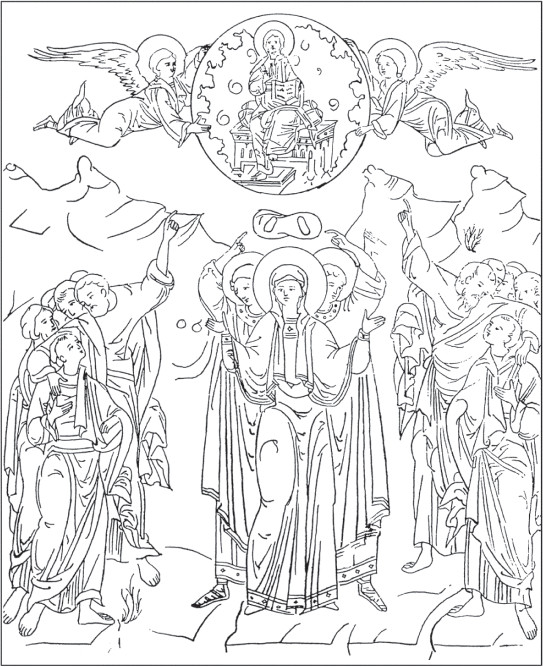 В день кончины Пресвятой Девы апостолы из разных стран земли, где они проповедовали Христа, были чудесно перенесены в Иерусалим Божией силой.