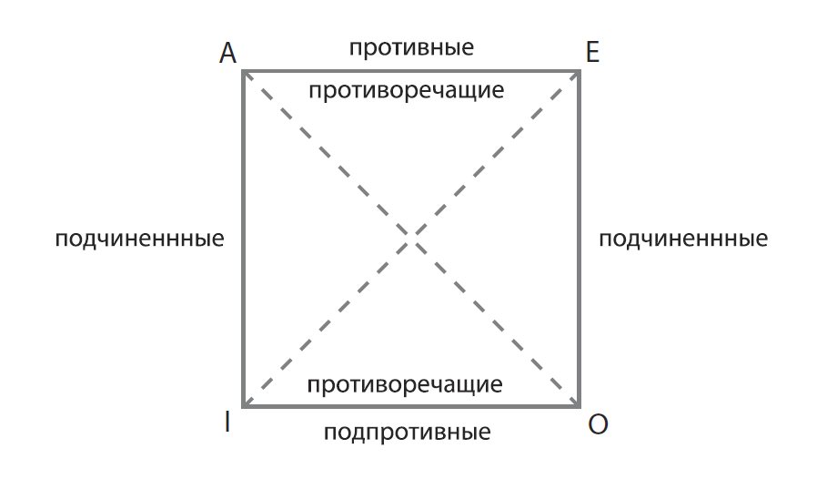 Возьмём квадрат и проведём в нём диагонали. У вершин четырёх его углов поставим буквы A, E, I, O, т.е. символы четырёх классов суждений. Возьмём какое-нибудь суждение и представим его в формах суждений всех четырёх классов: A – «все люди честны», E – «ни один человек не честен», I – «некоторые люди честны», O – «некоторые люди не суть честны».
