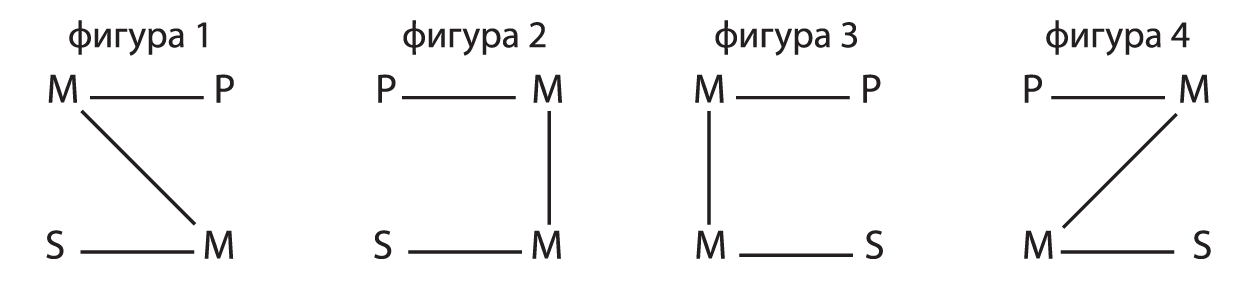 Фигуры и модусы силлогизма. В фигуре 1 средний термин является подлежащим в большей посылке, сказуемым – в меньшей. В фигуре 2 он является сказуемым в большей посылке, сказуемым же и в меньшей посылке. В фигуре 3 он является подлежащим и в большей и в меньшей посылке, и, наконец, в фигуре 4 он является сказуемым в большей посылке и подлежащим – в меньшей.