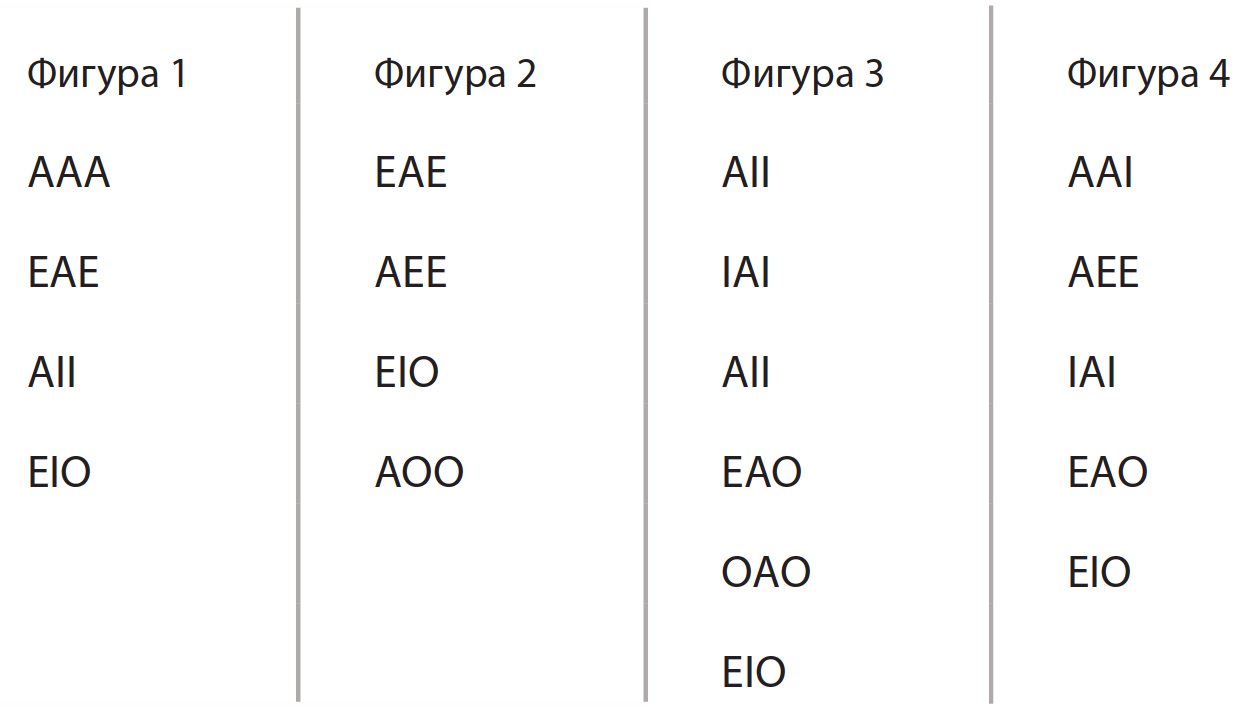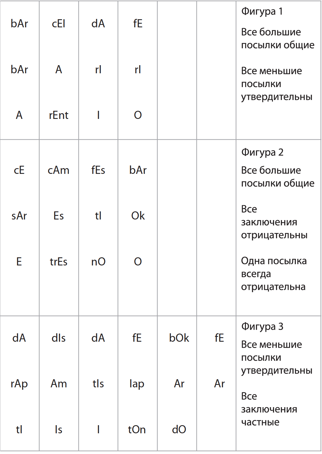 Характер посылок и заключений каждой фигуры может быть наглядно представлен, если мы буквы модусов каждой фигуры расположим по вертикальным линиям таким образом, что буквы больших посылок будут идти по горизонтальной, буквы меньших посылок по второй горизонтальной и буквы заключений по третьей горизонтальной.