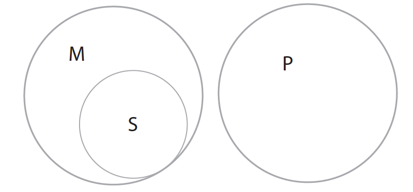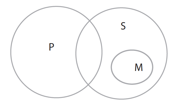 Этот силлогизм символически можно изобразить следующим образом. «Хищные животные» как средний термин обозначим при помощи M; «питающиеся мясом» как больший термин – посредством P, а «тигры» – посредством S; тогда силлогизм изобразится при помощи схемы на рис. 23.