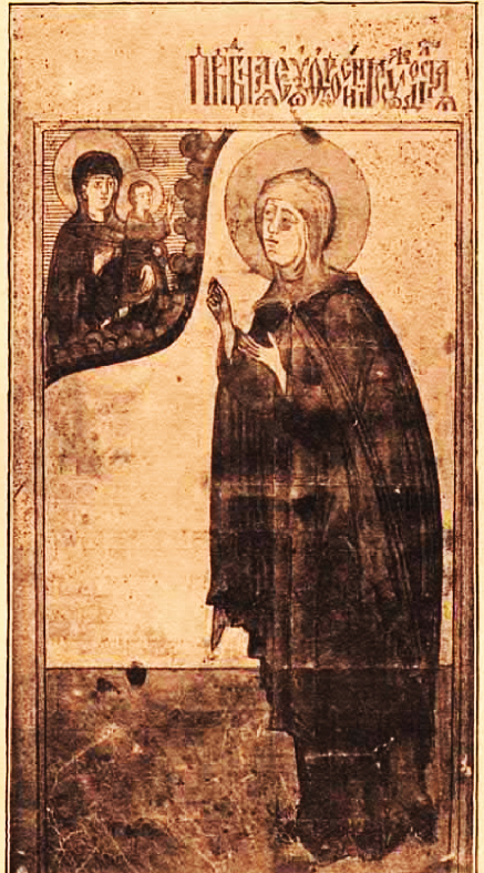 Предания о жизни и подвигах пр. Евфросинии, в мире Феодулии, дочери св. Великого Князя Черниговского Михаила, подвизавшейся в XIII веке, в Суздальском Ризположенском монастыре, долгое время после Её смерти не были записаны, а жили в памяти монахинь Ризположенского монастыря и устно передавались ими друг другу. С развитием просвещения в XV и нач. XVI в. в северной Руси, когда в различных местностях начинается появление целого ряда житий русских подвижников, появляется в Суздале и житие пр. Евфросинии, принадлежащее перу «творца канонов» и житий Суздальских святых «смиренного инока» Суздальского Спасо-Евфимиевского монастыря Григория. Время жизни и деятельности Григория после целого ряда учёных разногласий, точно установлено В. О. Ключевским, в известном труде его о древнерусских житиях святых110. На основании тщательного анализа сочинений Григория, В. О. Ключевский относит литературную деятельность его, ко второй четверти XVI столетия. Инок Григорий написал целый ряд житий святых, служб и канонов угодников Суздальских. Так, кроме жития, службы и канона пр. Евфросинии, инок Григорий написал житие пр. Евфимия, Суздальского чудотворца и канон ему, житие еп. Иоанна Суздальского с каноном, канон еп. Феодору и житие с каноном же пр. Козьмы, Яхромского чудотворца. Им же написаны похвальное слово и служба «новым чудотворцам», канонизованным на соборах 1547–1549 г. Таким образом, литературная деятельность его стоит в тесной связи с тем оживлением агиобиографической литературы, которая замечается в половине XVI в., одновременно с животрепещущими вопросами того времени о канонизации русских святых, издавна местно чтимых в разных областях Русского Государства, собранного к тому времени под власть единого самодержца Царя Московского и всея Руси.