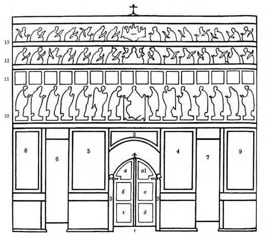 Графическая схема русского пятиярусного иконостаса: 1 – Святые, или Царские, Врата; а и al: Благовещение; б, в, г, д: Четыре евангелиста; 2 – Тайная вечеря; 3 – Столбики Царских Врат с изображениями святителей, творцов литургии; 4 – икона Христа; 5 – икона Богоматери; 6 и 7 – северная и южная двери иконостаса с иконами архангелов или диаконов; 8 и 9 – иконы местнопочитаемых святых; 10 – деисусный ряд; 11 – праздничный ряд; 12 – пророческий ряд; 13 – праотеческий ряд.