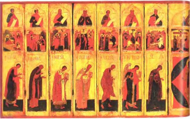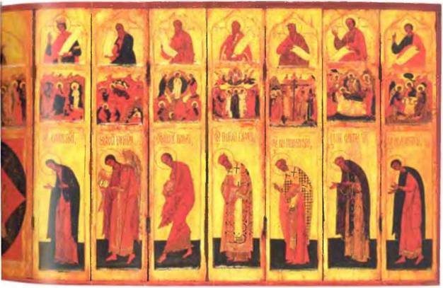 Воспроизведенный здесь (с. 104–105) иконостас-складень, состоящий из 15 частей, приписываемый середине XVI в.139, представляет собой классическую композицию православного иконостаса. Такие иконостасы служили для молитвы в частном доме, а также благодаря своим небольшим размерам, особенно в сложенном виде (высота нашего иконостаса 56 см, длина 196 см), брались в путешествия и походы. Отличие его от храмовых иконостасов заключается в том, что в нем нет нижней части, состоящей из местных икон, и трех дверей: средней, ведущей в алтарь, так называемых Царских Врат, северной, ведущей в жертвенник, и южной – в диаконник. Отсутствует в нем также обычный верхний ряд – праотеческий, представляющий собой первоначальную ветхозаветную Церковь начиная от Адама до закона Моисеева в виде ряда изображений ветхозаветных патриархов, предображающих Церковь новозаветную.