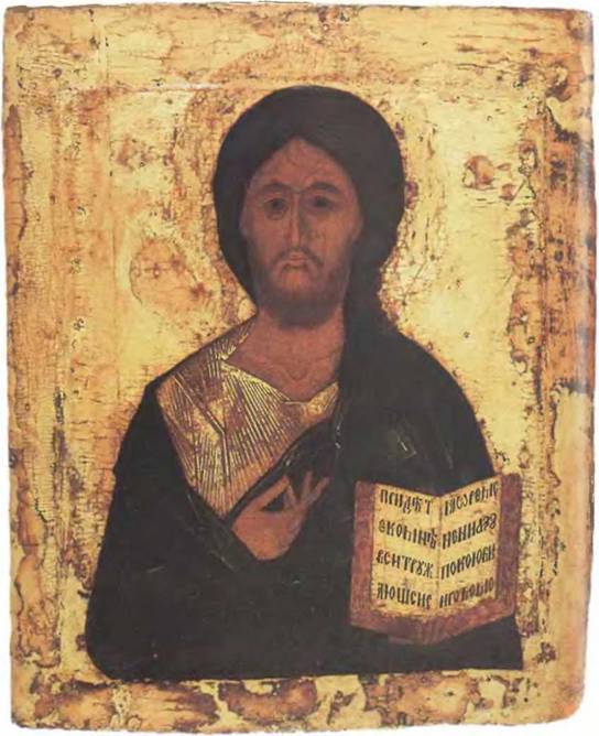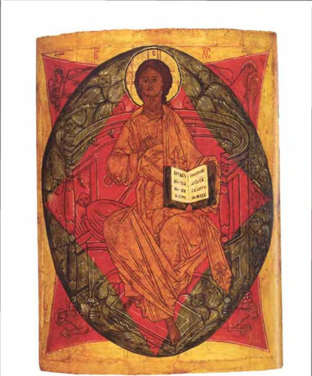 Большая икона, воспроизведенная на с. 124, датируется концом XV столетия. Здесь Спаситель изображен как Царь славы, окруженный небесными силами. Он восседает на великолепном резном престоле, благословляя правой рукой и держа в левой раскрытое Евангелие с комбинированным текстом: «Не на лицы зря судите, сынове человеческие, но праведен суд судите. Каким судом судите...» (ср.: Ин.7:24;