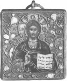 Еще одна воспроизведенная здесь икона типа Вседержителя – поясная, заключена в эмалевую рамку, которая следует контуру фигуры Христа. Он благословляет правой рукой и держит другой Евангелие, раскрытое на тех же словах, что и в первой описанной иконе. Здесь изображение Христа упрощено, менее утонченно разработано. На хитоне нет золотой разделки, и общий вид Спасителя не столь величествен: иконописец стремился передать скорее милосердие и кротость Искупителя как Господа, слышащего мольбы людей.