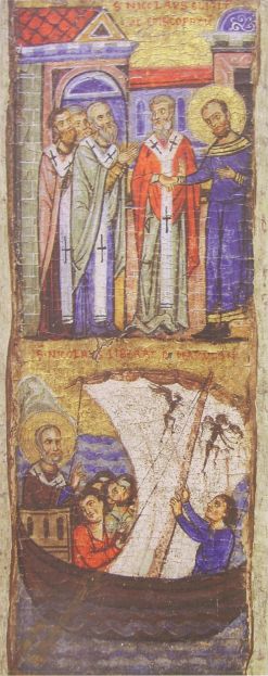Изображение святителя Николая вместе с тремя другими выдающимися отцами Церкви, один из которых был константинопольским патриархом, а два других – знаменитыми каппадокийскими отцами, вслед за попарно представленными апостолами и за фигурами Иоанна Предтечи и праведного Захарии, которые символично помещены по сторонам композиции «Сошествие во ад», – все это подчёркивает его особую важность и даёт представление о той духовной атмосфере, которая обусловила «священное похищение» в Мирах Ликийских. Город Бари принадлежал Византийской империи вплоть до судьбоносного 1071 г., потому нет ничего удивительного в таком почётном расположении образа святого Николая ещё до перенесения его мощей в 1087 г. Нас также не должны удивлять и другие свидетельства его исключительного почитания, будь то единичные изображения (как например, в Карпиньяно) или целые повествовательные циклы1100.