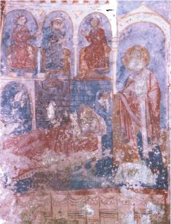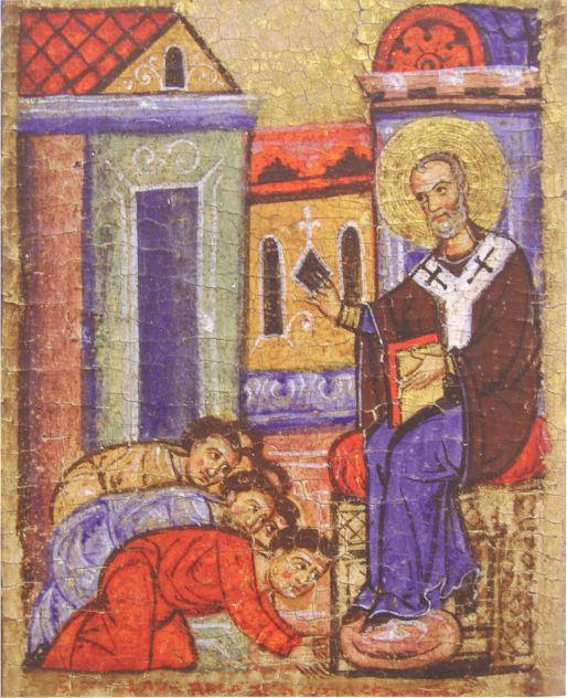 Другие «биографические» образы встречаются редко, к тому же они сохранились фрагментарно: таковы фресковые житийные изображения в Апулии (все не ранее второй половины XIII в.); в церквах Санта Мария деи Мираколи в Андрии, Санта Мария Маджоре в Монтесантанджело, Санта Мария Амальфитана в Монополи (ил.4:5)1106. Примером изображения, извлечённого из общего житийного цикла и представленного в виде отдельной иконы, может служить сцена дарения приданого отцу трёх бедных дочерей в церкви Санта Маргарита в Моттоле (ил. 6)1107.