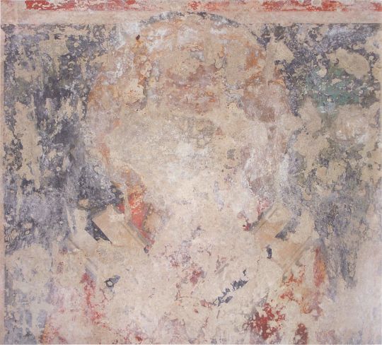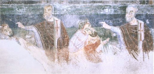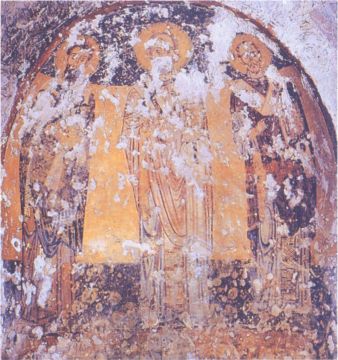18. Богоматерь между святым Паолино и святителем Николаем. Около 1100 г. Роспись в апсидиоле капеллы. Крипта Санта Мария ди Олеария близ Майори (Кампанья) (слева внизу)