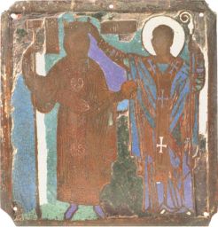 7. Святитель Николай венчает короной Роджера, короля Сицилии. Около 1132. Медная пластина с эмалью. Происходит с фронтона алтарного кивория собора в Бари. Бари, музей при соборе