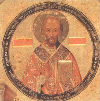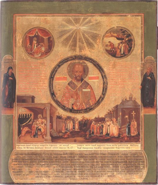 Чудотворная круглая икона святого Николая была установлена в иконостасе Никольского собора справа от царских врат, рядом с образом Христа1330. Она являлась одной из самых значительных святынь Новгорода и пользовалась особенной славой и почитанием1331. По этой причине великий князь Иван Васильевич перенёс её в 1502 г. в новую столицу – Москву, куда свозились все наиболее значительные иконы, чтобы обосновать древность и непрерывность княжеской власти. Икона святителя Николая была принесена в церковь Рождества Богородицы в Кремле и там погибла в 1626 г. во время пожара1332.