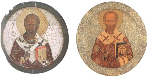 По мнению О.Е. Этингоф, относительно круглой иконы речь идёт предположительно об упоминающемся в повести «Чудо святителя Николая о киевском младенце» 1092 г. образе Николы Мокрого из Софийского собора в Киеве. См.: Этингоф. Византийские иконы. С. 79–83; Lidov. «Il dio russo». Р. 79.
