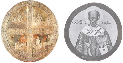 Ещё одна копия, диаметром 58 см, которая была помещена в иконостас Николо-Дворищенского собора, тоже находится сейчас в Новгородском музее (ил. 8). Она была написана в начале XVII в. и поновлена в XVIII в. Фон иконы покрыт чеканным позолоченным окладом, который украшает епископские одеяния святого Николая пышным орнаментом1337. В 1886 г. на оборотной стороне иконы появился оклад, где на четырёх полях представлено предание об исцелении князя1338 (ил. 9).