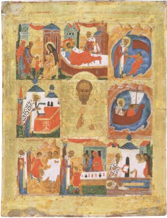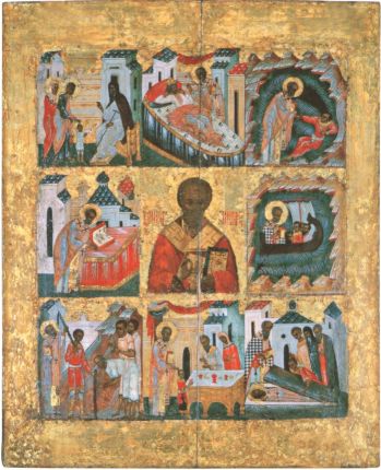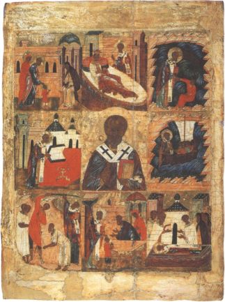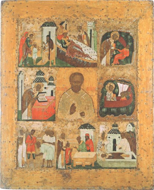 К особой группе можно отнести несколько житийных икон Николы Великорецкого середины – второй половины XVI в. Это икона из Воскресенского собора Вологды (прежде, из церкви Николы «на извести») (ныне в ВГИАХМЗ)1472, Кирилло-Белозерского монастыря (КБИАХМЗ)1473, собрания итальянского банка «Интеза» (палаццо Монтанари, Виченца)1474, из церкви Рождества Богородицы деревни Луды (Архангельск, ГМО «Художественная культура Русского Севера»)1475. В среднике этих икон размещено поясное изображение святого Николая в традиционном варианте: старец с округлой головой, глубокими залысинами, которые подчёркивают высокий лоб с морщинами, пристальным взглядом, устремлённым в сторону. Облачение святителя составляют фелонь и омофор. Святитель благословляет правой рукой, поднятой слегка перед грудью, на левой руке – закрытое Евангелие.