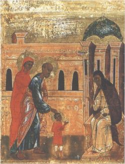 Сцена «Приведение во учение» иконографией повторяет Введение во храм Богоматери. Иконографическое родство обусловлено сходством смысловых акцентов: взрослые вводят ребёнка в храм, торжественно и празднично, маленький человек, приобщающийся мудрости и благодати, находится в центре забот и ласкового покровительства. Отец, прикасаясь к головке, подводит маленького Николая к монаху-учителю, мать стоит за его спиной, вторя его движениям. Важность этой сцены подчёркнута тем, что она, а не традиционное рождение открывает житийный цикл. Приведение к учению в данном контексте можно понимать как духовное рождение, вступление на порог веры, мудрости, готовности к житейскому и житийному пути. Одежды родителей, особенно красный мафорий матери Николая, напоминают образы праведных прародителей, прежде всего, праведной Анны, матери Пресвятой Богородицы, и праведной Елизаветы, матери Иоанна Предтечи. На иконе из Виченцы отец святого Николая одет в античные одежды, чем ещё сильнее сходство его образа с праведным Иоакимом в сцене Введения Богоматери во храм. На иконе из Кирилло-Белозерского монастыря на голове матери святого Николая изображён белый плат, что сближает её облик с другой праматерью – Саррой, вместе с супругом, Авраамом, удостоенной видения Святой Троицы.