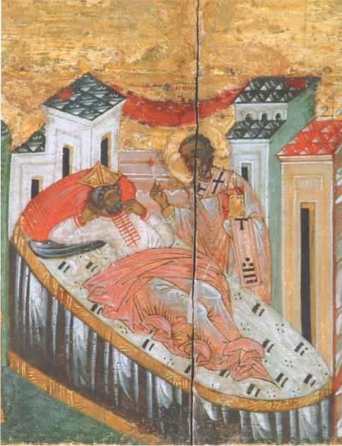 То, что святитель Николай является именно к царю1480, подчёркнуто одеждами и атрибутами – золотой венец с тремя окончаниями (Вологда, Виченца), иногда отмеченными жемчугом (Вологда), одежды: синие (Вологда, Луды), белые (Виченца, Кирилло-Белозерский монастырь) украшены золотым шитьём. Момент действия может меняться: Константин спит, положив руку под голову (КБИАХМЗ), он накрыт покрывалом и обездвижен (Луды) или пробуждён чудесным явлением незнакомого мужа и беседует с ним, поднеся одну руку к груди, другую держа перед собой (Вологда), чуть приподняв одну руку, в то время как другая окутана покрывалом (Виченца). Сцена по иконографии напоминает композицию Рождества или ещё более исцеления, совершаемого Христом. Назначение сцены, её помещение расположение в верхнем регистре, в отрыве от композиции «Чудо о трёх воеводах» (в нижнем ряду, в левом углу) можно связать с напоминанием о чуде, случившемся во время первого Никейского собора, созванного именно Константином. В явлении архипастыря Николая проснувшемуся царю подчёркивается встреча двух самых ярких представителей ветвей христианской власти – мирской и святительской. Возможно, это сопоставление имело актуальный смысл для эпохи создания житийной программы Великорецкой иконы.